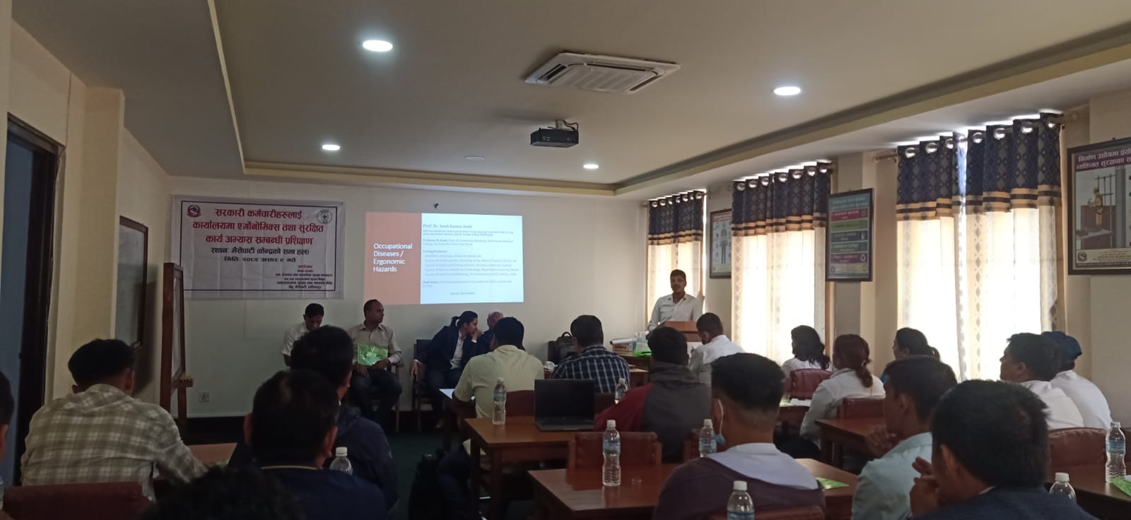 सरकारी कर्मचारीहरुलाई कार्यालयमा एर्गोनोमिक्स तथा सुरक्षित कार्य अभ्यास सम्बन्धी प्रशिक्षणको क्रममा