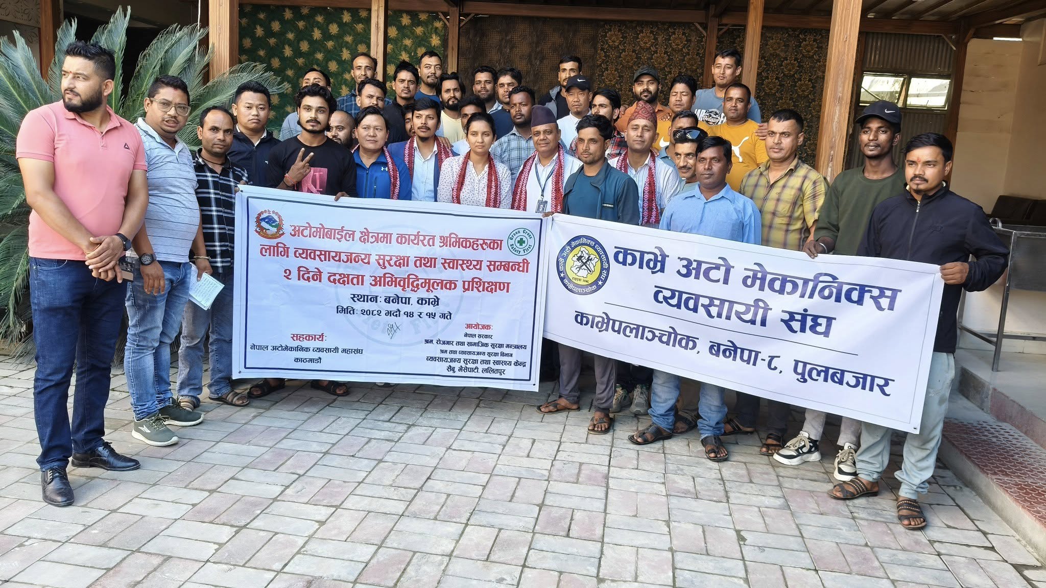 अटोमोवाईल क्षेत्रमा कार्यरत श्रमिकहरुका लागि व्यवसायजन्य सुरक्षा तथा स्वास्थ्य सम्बन्धी २ दिने दक्षता अभिवद्धिमूलक प्रशिक्षण बनेपा काभ्रेपलाञ्चोकमा सम्पन्न पश्चात् लिइएको सामूहिक तस्बीर